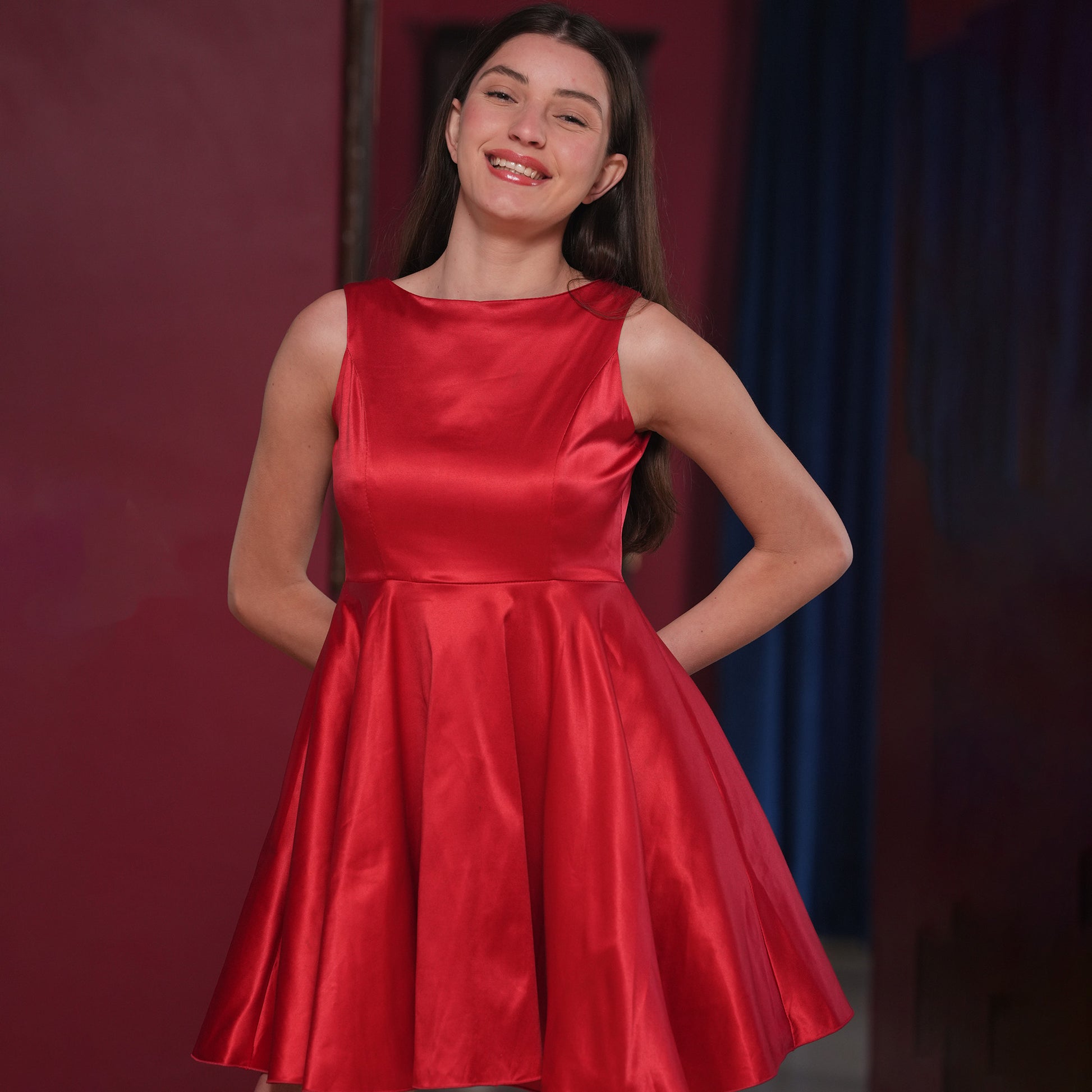 A vibrant red fit-and-flare dress with a smooth satin finish and a structured bodice. Playful yet elegant, designed for celebrations, dinners, and festive moments.