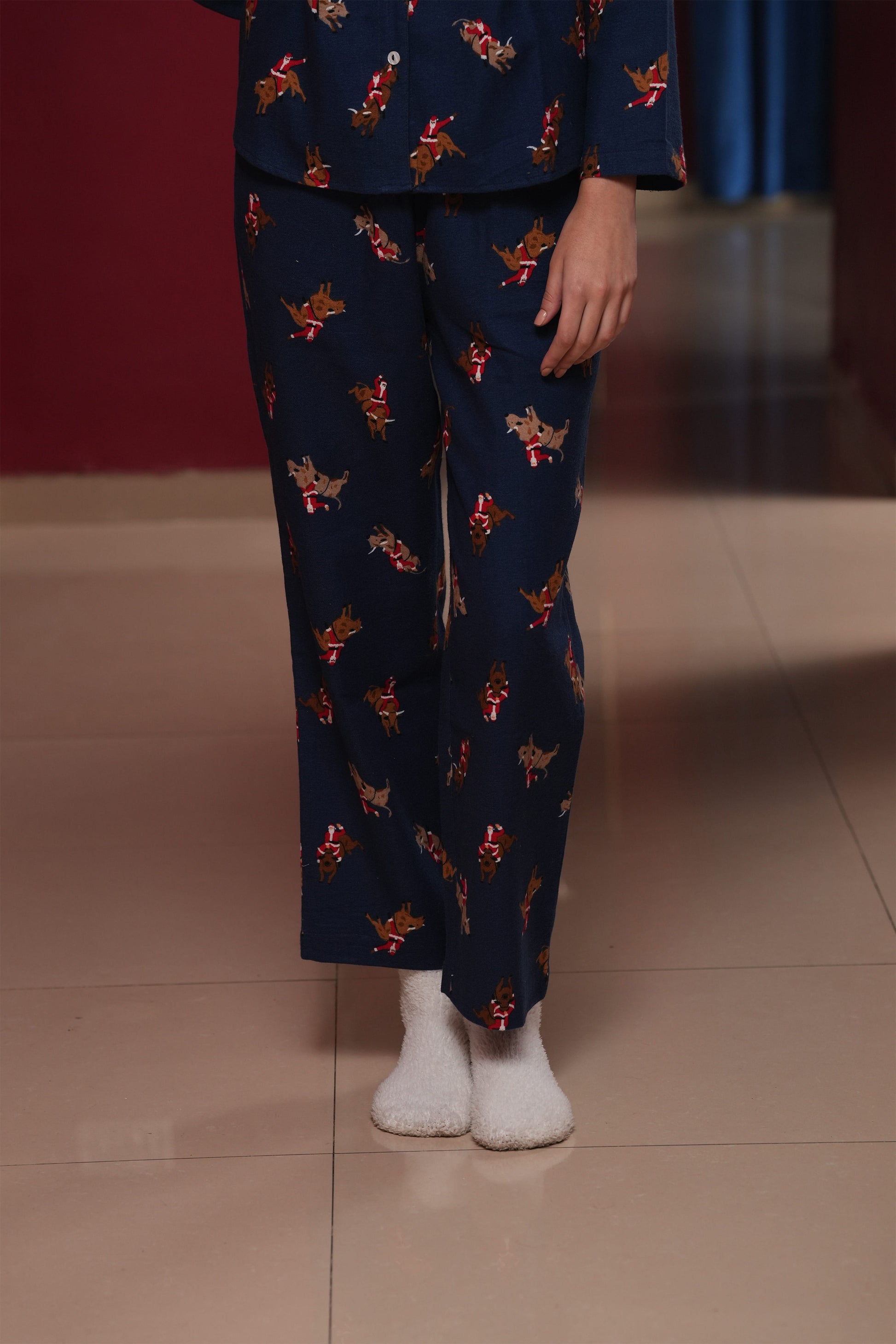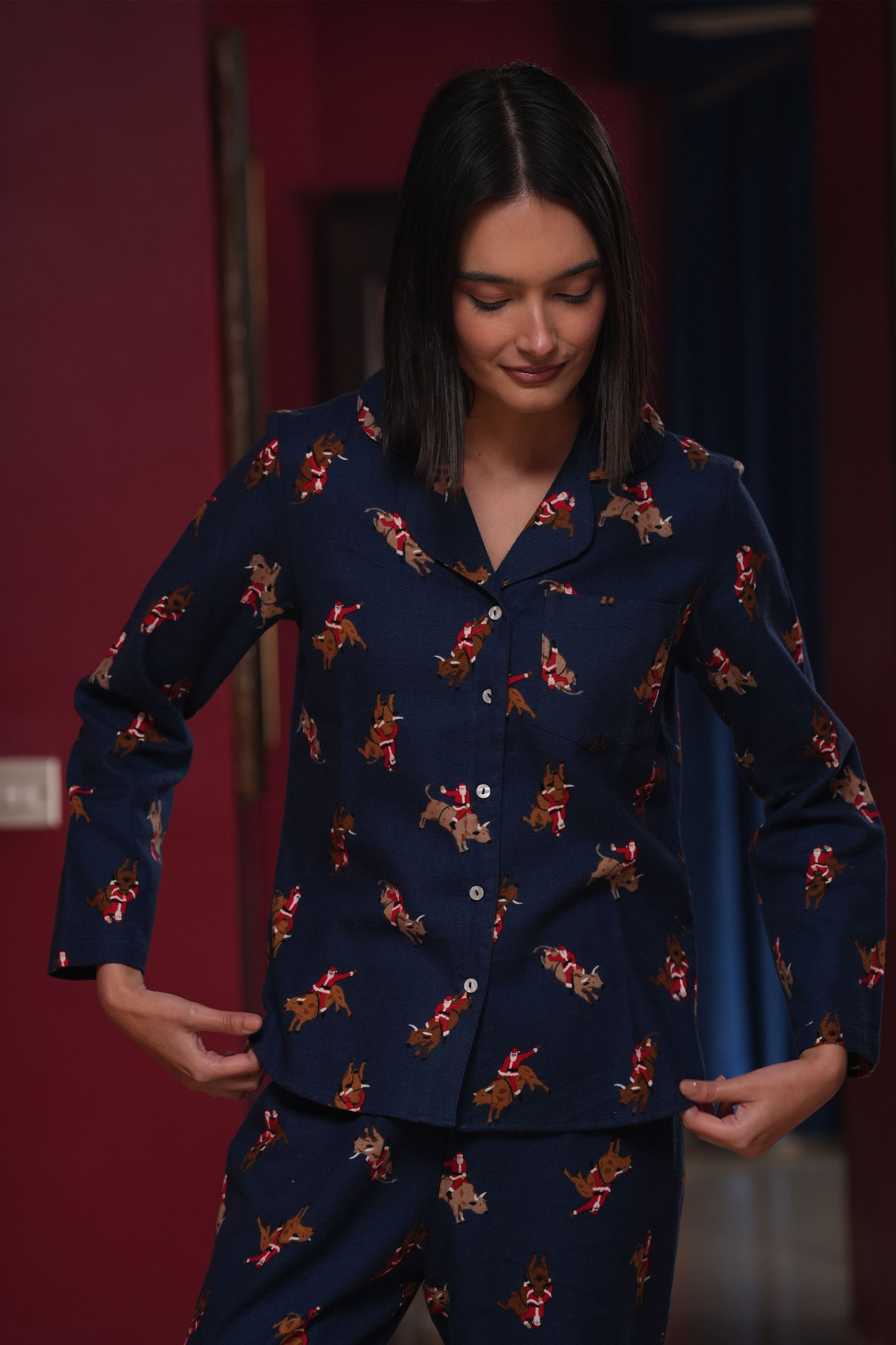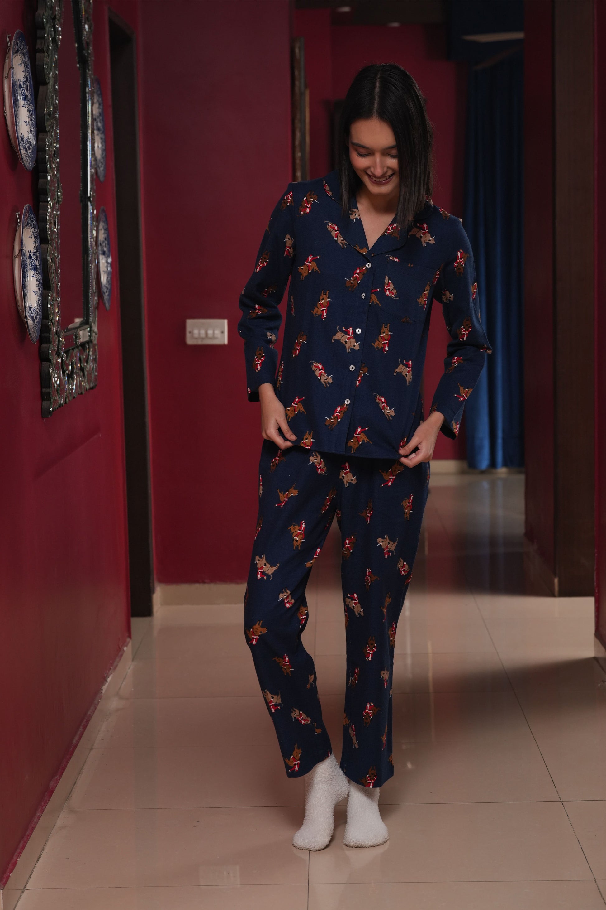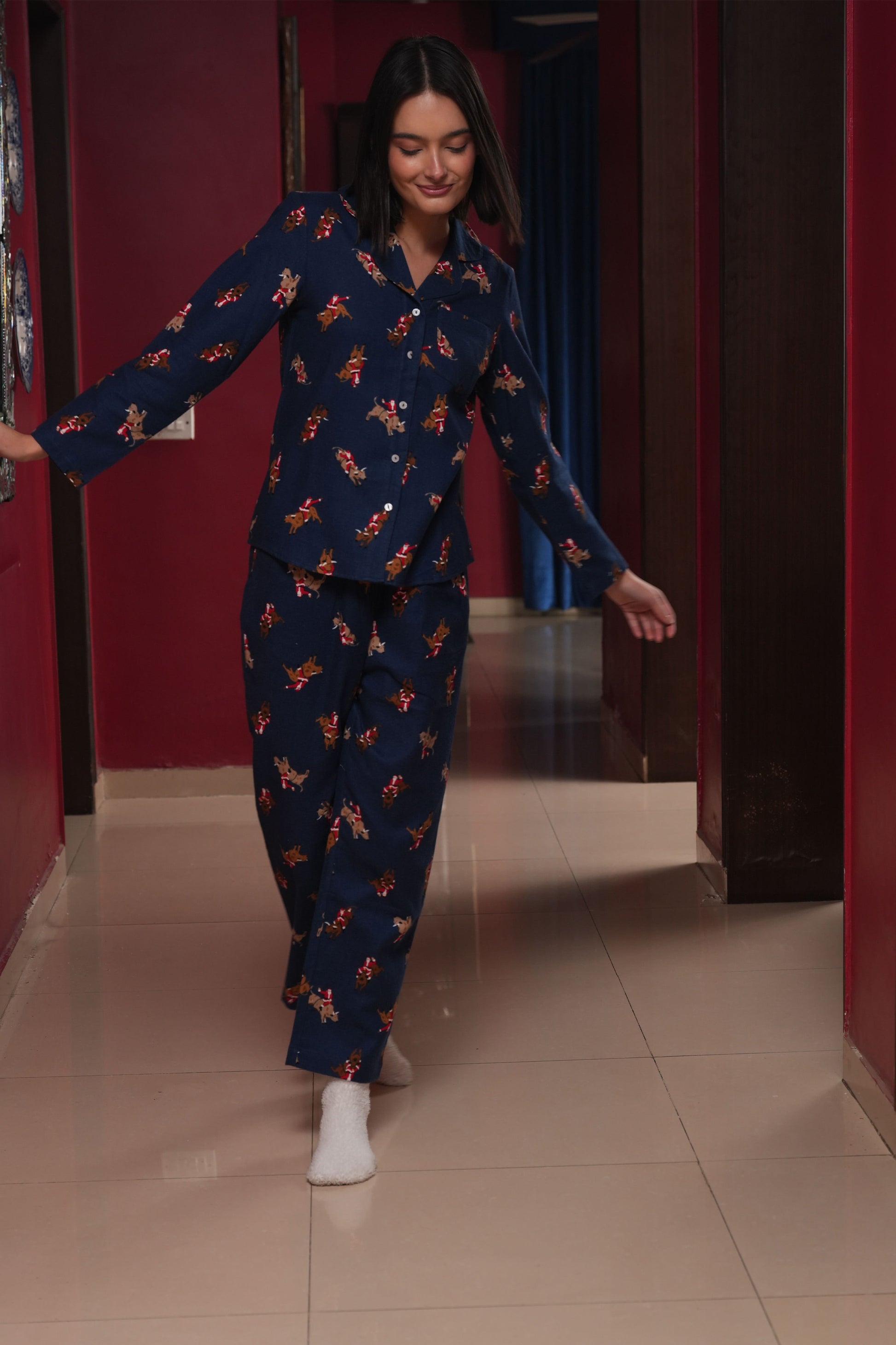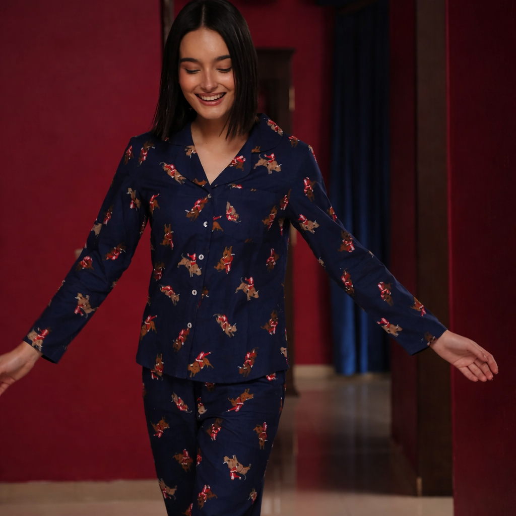 A deep navy night suit featuring playful reindeer prints and an easy button-down silhouette. Designed for winter comfort with a festive touch.