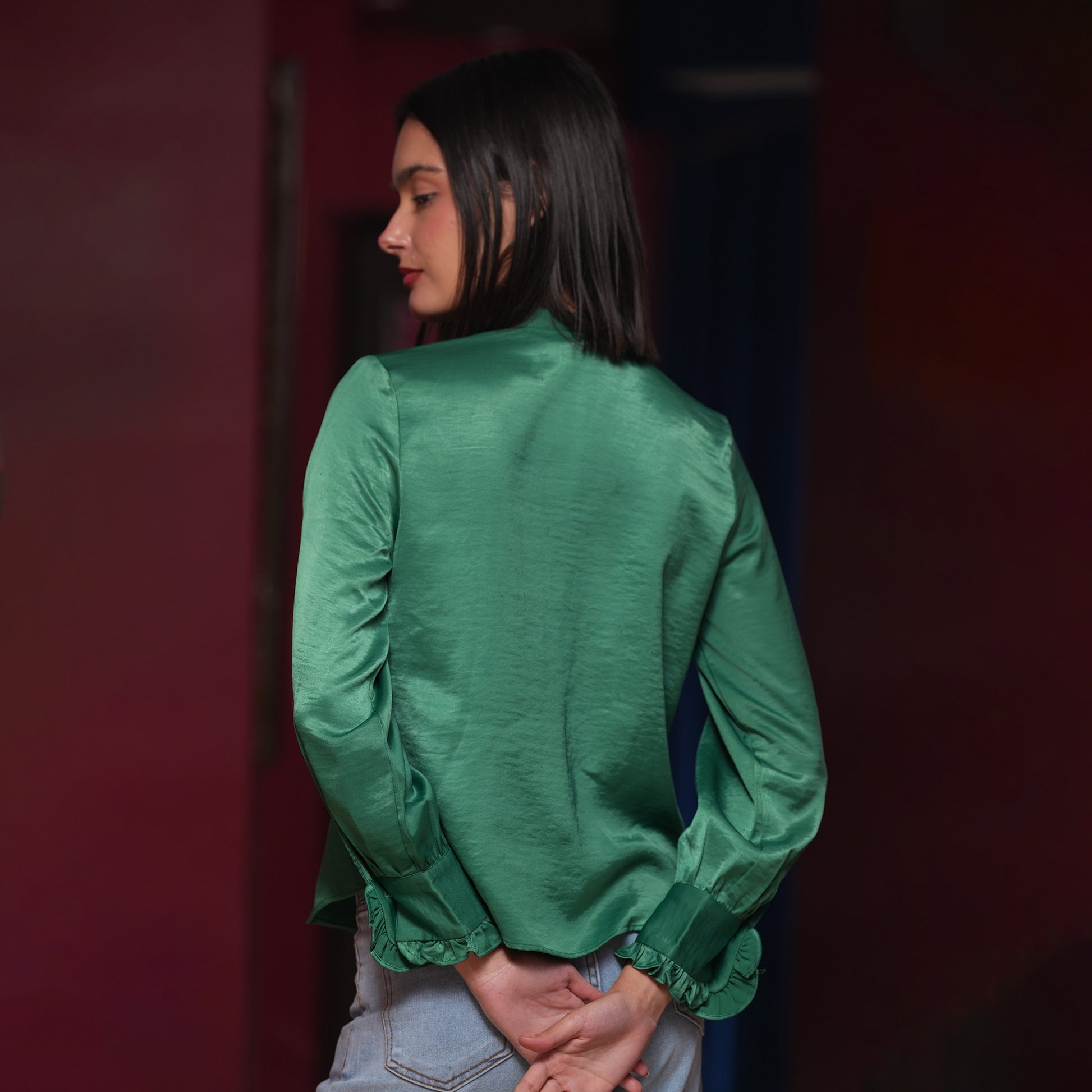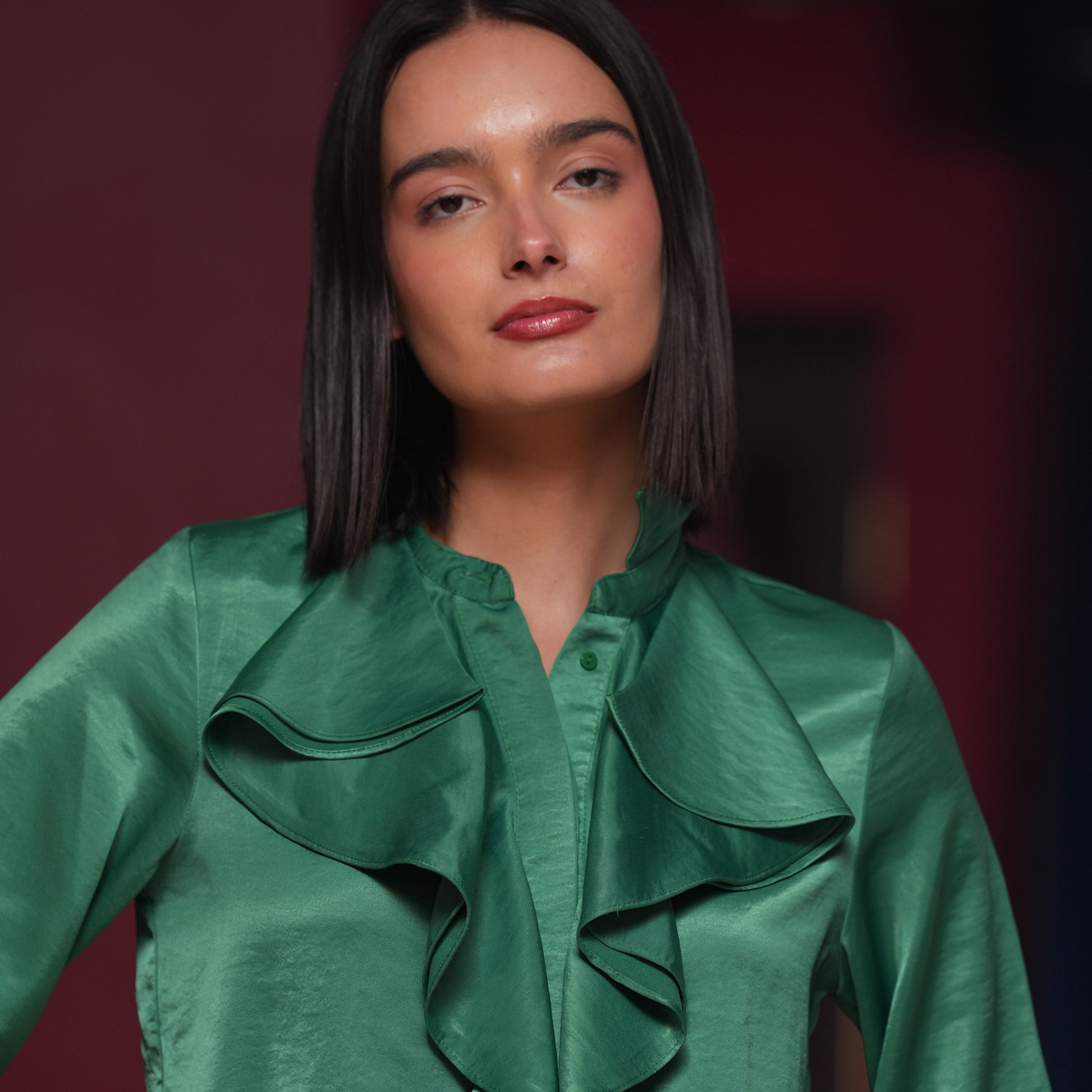 A timeless classic reimagined with a touch of romance, The Ruffle Collar Satin Shirt blends sophistication with feminine flair. Crafted from smooth satin, it features a delicate ruffled collar that adds texture and charm to a sleek, structured silhouette. Perfect for pairing with tailored trousers, denim, or skirts, it transitions seamlessly from work to evening wear.