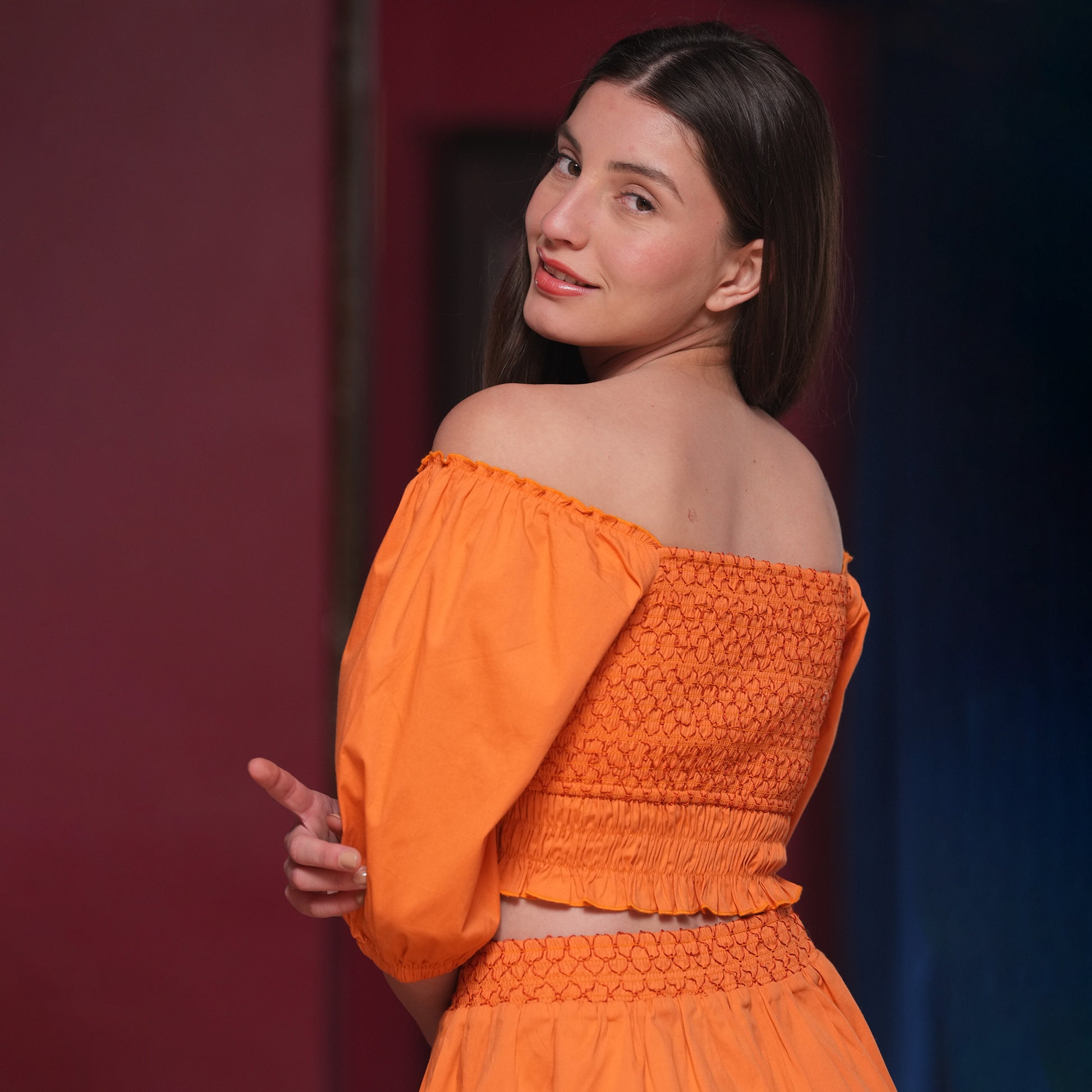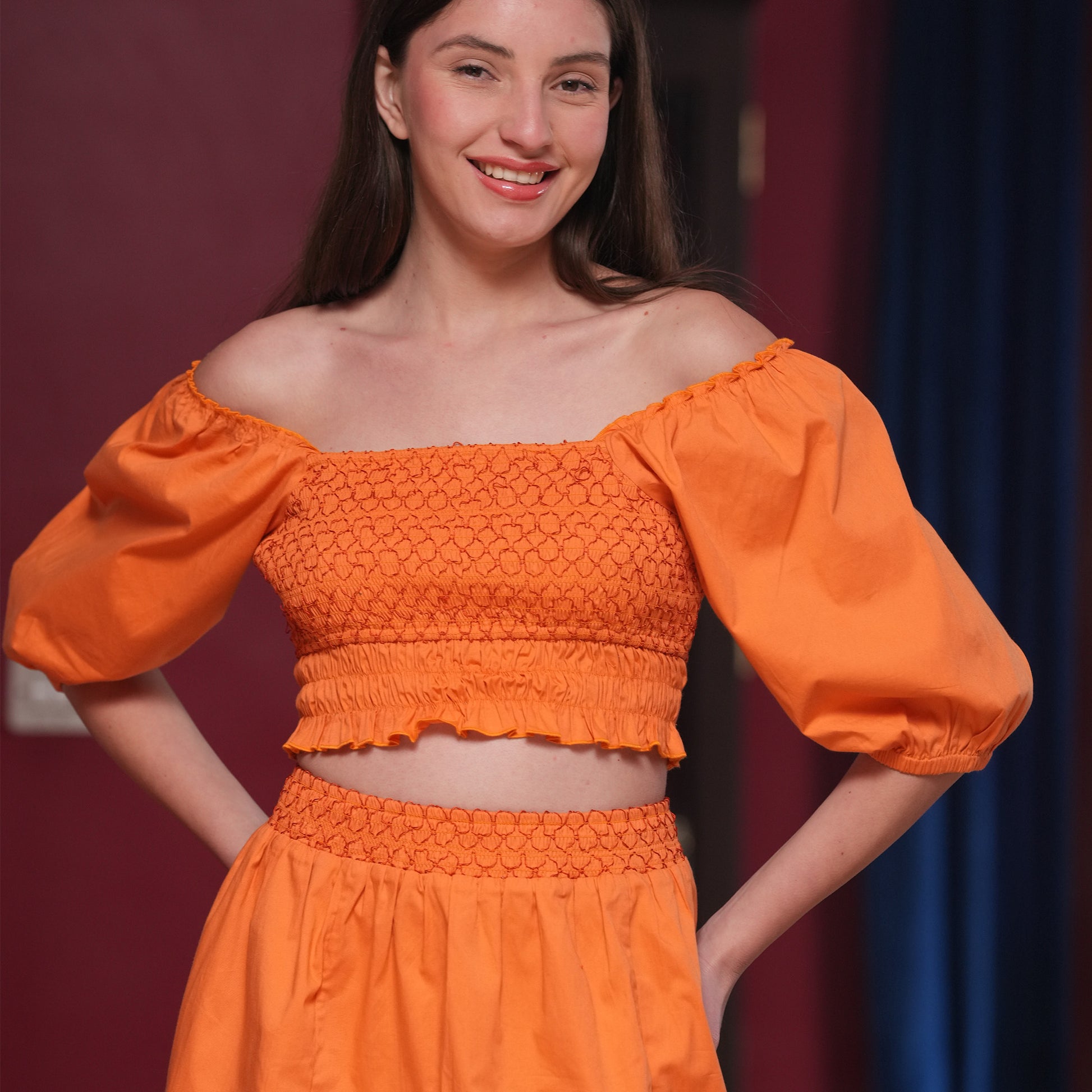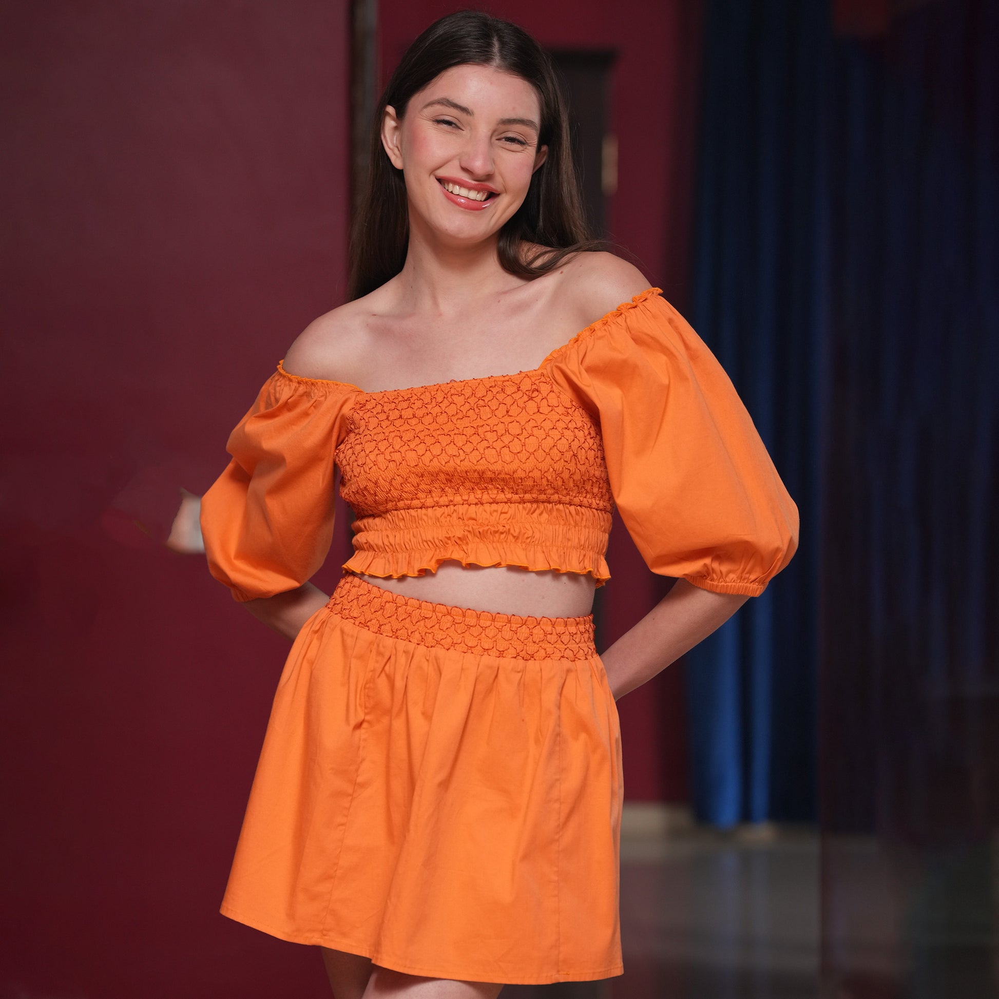 A playful yet polished co-ord set featuring a smocked top with balloon sleeves and a matching mini skirt. Designed in breathable poplin lycra, it offers the perfect blend of structure and stretch for an ultra-flattering fit. The cropped top features a snug, smocked bodice that moves with you, while the mini skirt brings a feminine, flirty finish, making it your go-to look for brunches, day parties, or weekend getaways.