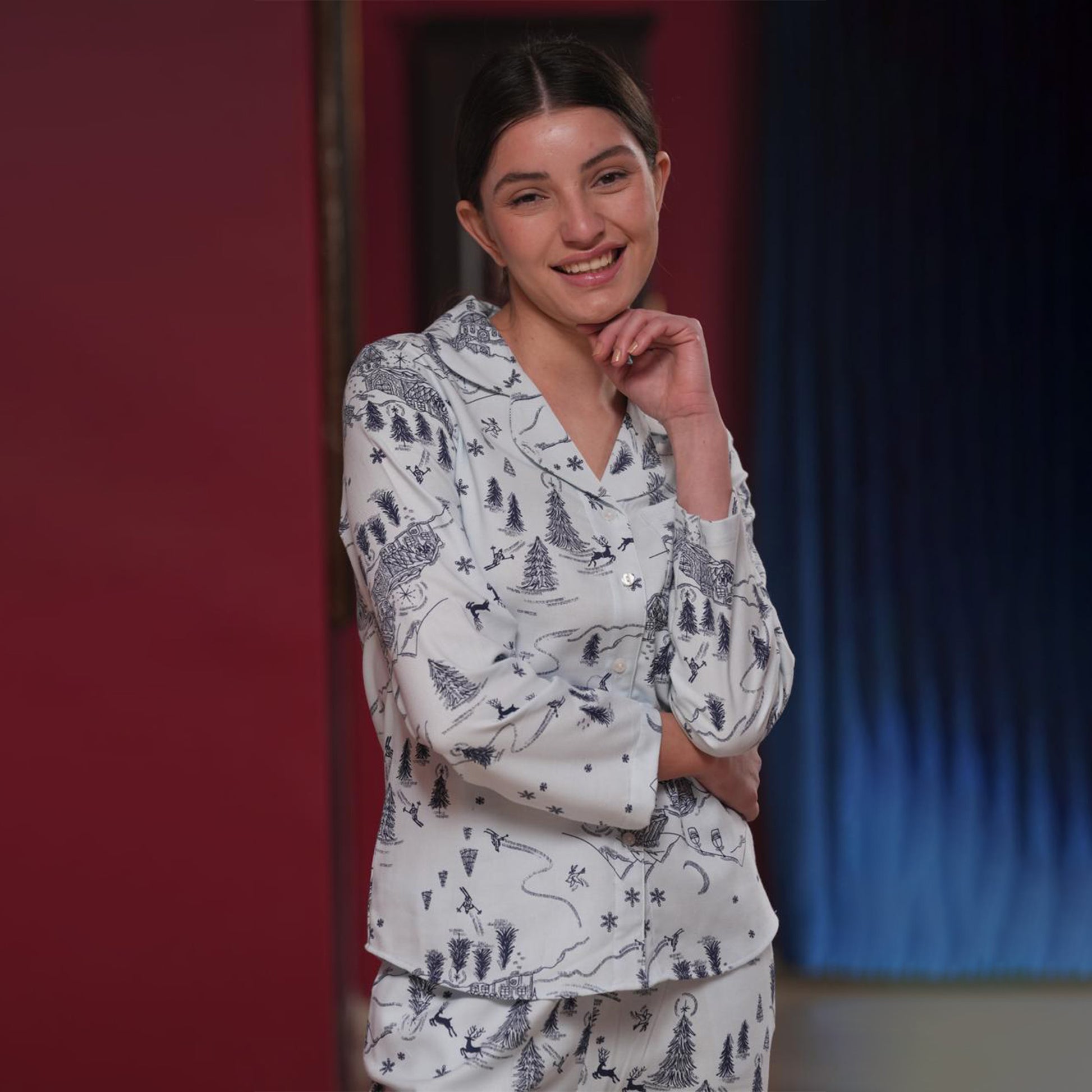 A classic white night suit with subtle winter illustrations and a relaxed, breathable design. Soft on the skin and perfect for everyday nightwear.